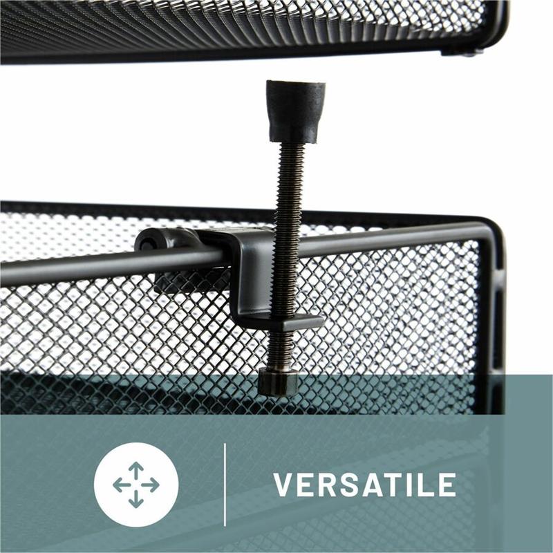 Fits up to 1 3/4 in. thick desktop and secures with the included tightening screw. 4 compartments and a pencil tray. 10-1/4 x 12-3/8 x 14-3/8 in. H. Black.