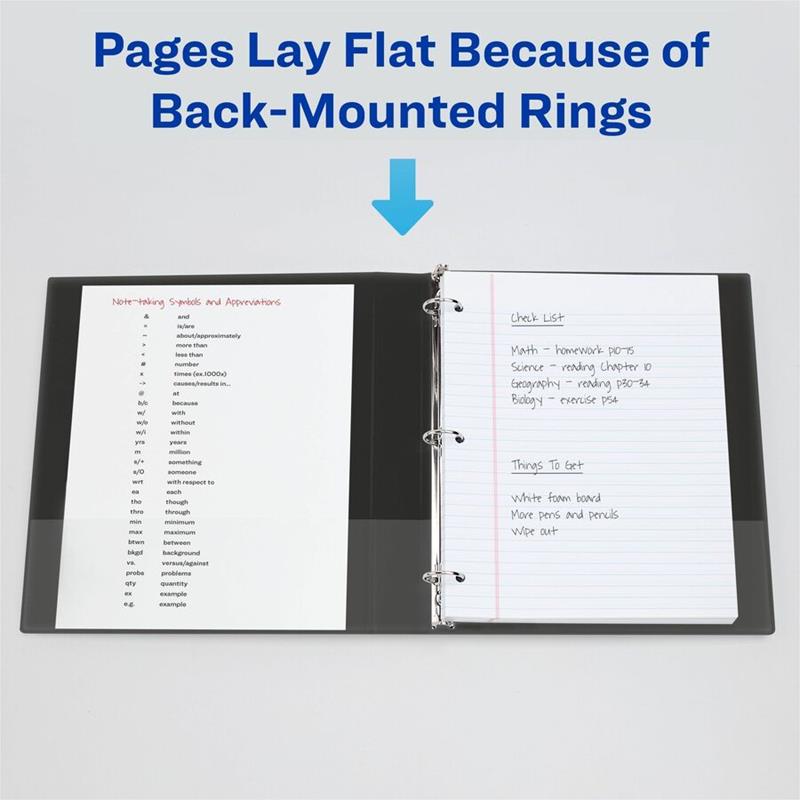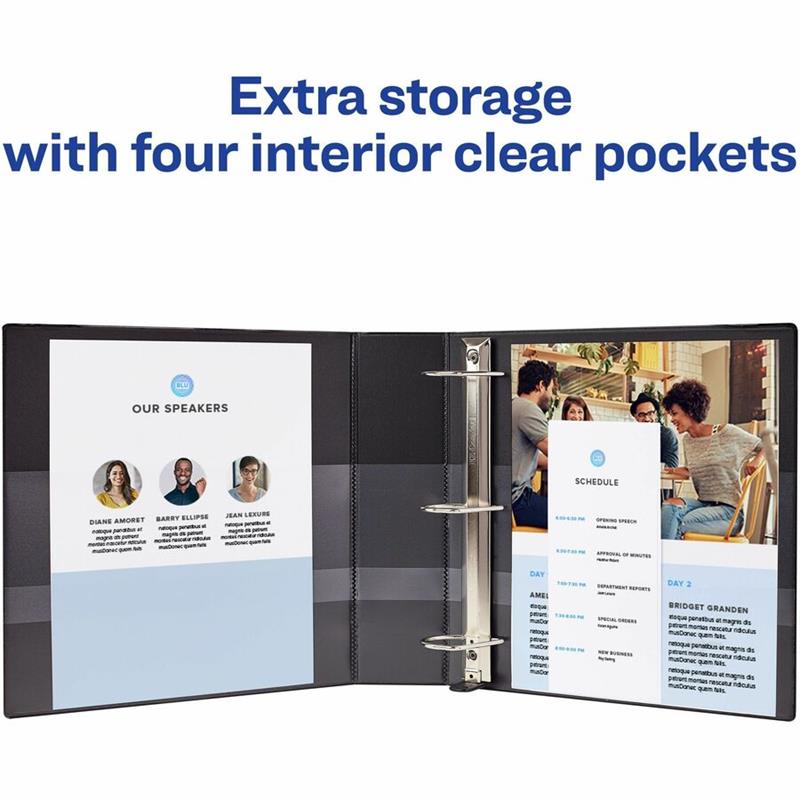 One Touch™ Locking D rings open with ease and keep pages secure. Gap Free ring prevents gapping and misalignment of rings. Letter size. Clear pockets on front, spine and back. Easy insert spine. No ink or toner transfer. 2 stacked inside pockets on each side. White.