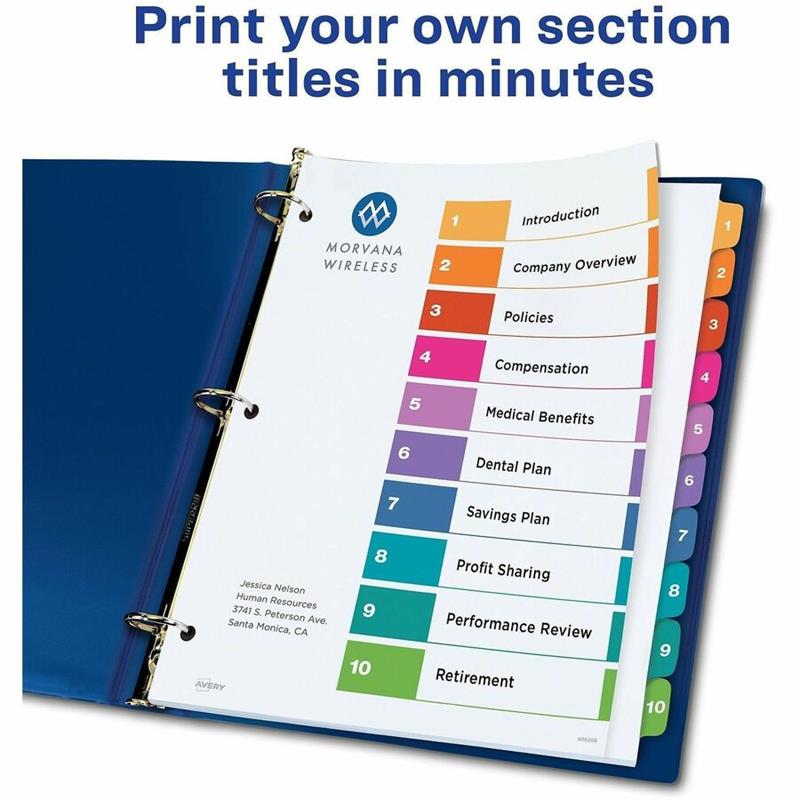 For ink jet, laser printers, copiers and typewriters. Portrait or landscape. Compatible with all Avery software and current text editors. 20% post-consumer waste.