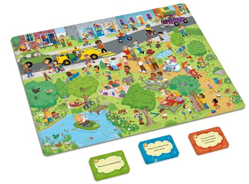 Un jeu de cherche et trouve coloré pour aider les enfants à comprendre les consignes dans différentes catégories ! Pour soutenir l'enfant dans son développement cognitif et langagier, il est pertinent de l'exposer à des consignes de formes et de longueurs variées ainsi qu'à différentes catégories d'éléments. C'est ce que propose le jeu que le meilleur trouve! dans lequel les enfants doivent comprendre des consignes faisant intervenir différentes catégories (moyens de transport, instruments de musique, personnes, objets, etc.) puis tenter d'être le joueur le plus rapide à repérer des éléments dans une scène illustrée. Comment jouer : Les jouerus observent le plateau de jeu pendant que l'adulte lit une consigne sans montrer le dos de la carte aux joueurs. Dès qu'un joueur repère un élément correspondant, il le pointe. Si la réponse est correcte, il gagne la carte. La partie continue avec de nouvelles consignes lues par l'adulte. Celui qui accumule le plus de cartes remporte la partie. Comprend : 1 plateau de jeu en 9 morceaux de casse-tête, 90 cartes (3 niveaux), 1 guide d'accompagnement et les règles du jeu 3+ ans / 1 à 3 joueurs / 15 min