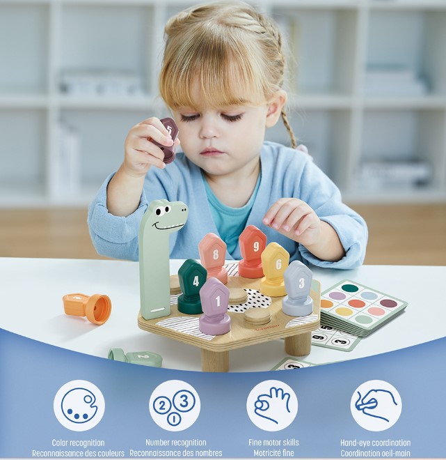 Le Happy Dino Twist de TOP BRIGHT offre aux enfants une expérience ludique et éducative. Ce jouet Montessori en bois comprend un dinosaure sympathique, 9 bouchons de bouteille colorés et 10 cartes recto-verso pour aider les enfants à développer des compétences essentielles. Parfait pour améliorer la motricité fine, le développement cognitif et la reconnaissance des nombres et des couleurs, le Happy Dino Twist est un complément fantastique à la boîte à outils d'apprentissage de tout enfant. Sa construction sûre et durable garantit la tranquillité d'esprit des parents, ce qui en fait un excellent cadeau pour les anniversaires, les vacances ou toute autre occasion spéciale. Conçu pour enseigner les couleurs aux enfants, le Happy Dino Twist comprend 10 cartes recto-verso avec différents motifs de couleurs. Les enfants peuvent associer les couleurs des capsules de bouteilles aux motifs des cartes, ce qui leur permet d'améliorer leur reconnaissance des couleurs et leurs capacités cognitives. Avec le Happy Dino Twist, la reconnaissance des nombres et le comptage deviennent des activités amusantes. Le jouet est livré avec 10 cartes recto-verso représentant différents chiffres et motifs. Les enfants peuvent faire correspondre les chiffres figurant sur les capsules de bouteilles à ceux des cartes, ce qui les aide à développer leurs compétences numériques et leur compréhension des séquences. Cet outil éducatif est parfait pour préparer les jeunes apprenants aux futurs concepts mathématiques. Le Happy Dino Twist est doté d'un mécanisme de torsion unique qui ajoute un élément amusant et interactif à l'apprentissage. Les enfants peuvent tourner les bouchons de bouteille colorés pour faire correspondre les chiffres ou les couleurs, améliorant ainsi leur motricité fine et leur coordination œil-main. Cette action de torsion amusante permet aux enfants de se divertir tout en apprenant, rendant l'éducation à la fois agréable et efficace. 3+ ans